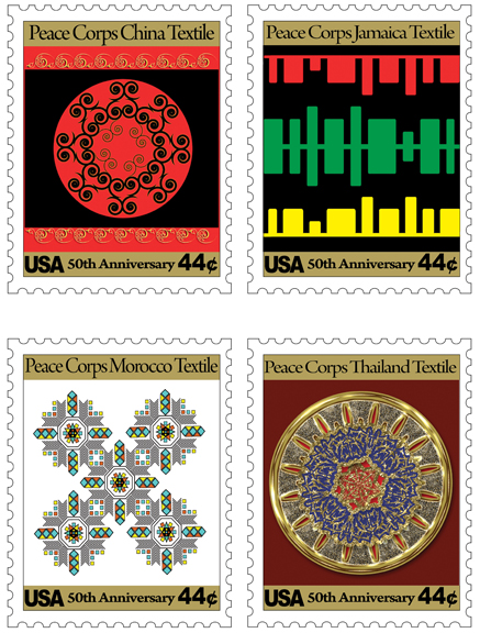 Stamps. Project to showcase the anniversay of the Peace Corps. These are showing textiles from countries visited.